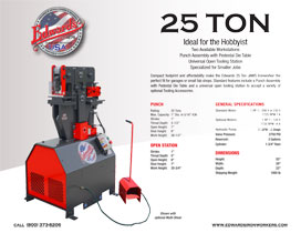Diseño compacto y precio asequible, hace de la Edwards 25 ton la herramienta perfecta para talleres pequeños y aficionados. Las características principales incluyen punzonado y activación con el pedal, cizalla para platina y ángulo y estación universal abierta de herramientas diseñada para aceptar herramientas adicionales.