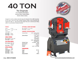 Diseñada para talleres medianos y pequeños, la Edwards de 40 ton tiene las herramientas necesarias para su trabajo. Las características incluyen punzonado y activación con el pedal. 10’’ de cizalla para platina, cortador de ángulos y una estación universal abierta para herramientas opcionales.