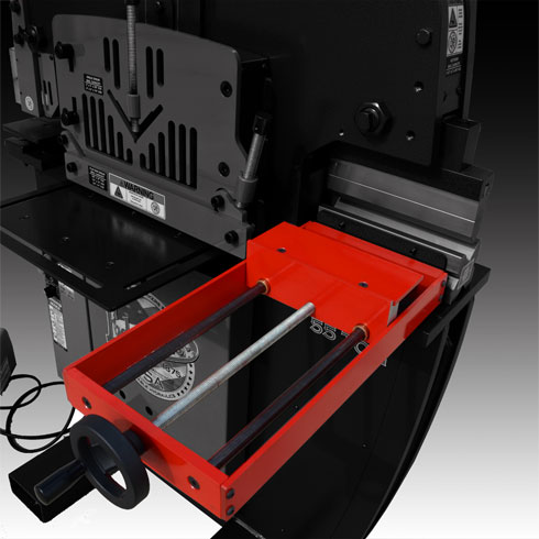Our adjustable Press Brake Back Gauge makes for easy set-up of repeatable bends. Simply bolt it up to the Edwards Ironworker Brake Tooling assembly or Press Brake Tooling for our 20 Ton Shop Press and 40 Ton Shop Press, and a simple hand crank glides the carriage backstop to your desired brake location.
